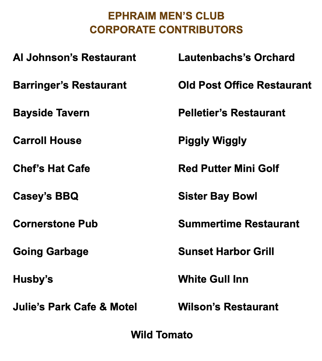 This year’s breakfast is Saturday August 2nd, 7:30-11am at the Ephraim Village Hall, located at 9996 S. Water Street, just north of Wilson’s Restaurant & Ice Cream Parlor.